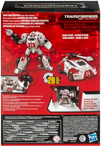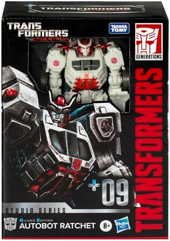 Product Description Bring the epic action from the Transformers video games into your collection with the Transformers Studio Series Deluxe Class 09 Gamer Edition Ratchet action figure, inspired by the Transformers: War for Cybertron video game! Transformers Studio Series Gamer Edition toys are collectible action figures that feature video game-inspired details and accessories. Convert the Studio Series Transformers action figure from robot to Cybertronian sports car mode in 28 steps and pose the Ratchet toy in the included Iacon Attack removable backdrop scene. Key Features: TRANSFORMERS STUDIO SERIES GAMER EDITION: Transformers Studio Series is expanding into the video game universe! These collectible Transformers action figures are based on the Transformers video games,TRANSFORMERS: WAR FOR CYBERTRON RATCHET: This Transformers Studio Series 09 Gamer Edition Ratchet action figure is highly articulated for posability and features video game-inspired deco and details,TRANSFORMERS TOYS STUDIO SERIES VOYAGER CLASS: This 6.5-inch (16.5 cm) collectible action figures is inspired by iconic movie scenes and designed with specs and details to reflect the Transformers movie universe,2 ICONIC MODES: This Studio Series Transformers toy features classic conversion between robot and Cybertronian sports car modes in 28 steps,AWESOME ACCESSORIES: Transformers figure comes with a blaster and an axe that attach in both modes,ARTICULATED FOR PLAY AND DISPLAY: Transformers figures feature articulated heads, arms, and legs for action poses,REMOVABLE BACKDROP: Removable backdrop displays the Transformers Studio Series Ratchet figure in the Iacon Attack scene This product is designed with premium quality, ensuring durability and superior performance.