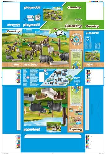 Product Description Help tend to the animals on the Farm. The happy animals await your arrival. This set is made from more than 80% sustainable materials on average. Play with this set on its own or combine it with other PLAYMOBIL Farm sets (71304-71309) for even more fun. The set includes two pigs, two cows, two sheep, two goats, two birds, tree, fencing and feed trough. Recommended for ages four through ten. Warning. Choking Hazard. Small parts. Key Features: Fill the trough with food and water for the pigs, sheep and goat,The cow feeds her new calf in the enclosure,On a hot day the animals can stay in the shade from the tree,This set is made from an average of more than 80% sustainable materials This product is designed with premium quality, ensuring durability and superior performance.
