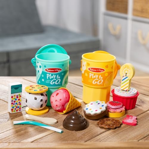 Product Description Take imagination on the go and create deliciously fun ice cream treats or cakes and cookies anywhere, any time! The two-pack bundle includes two take-along play sets in durable cups with a handle and attached lid. Play to Go cups are chock full of wooden and fabric play food -- one for making ice cream cones, ice cream sandwiches, and fun milkshakes and the other for making decorated cookies, cupcakes, and layer cakes. Key Features: Create deliciously fun pretend play ice cream treats or cakes and cookies with fabric and wood play food in on-the-go cups made to fit in cup holders in cars, car seats, and strollers,11-piece Play to Go Ice Cream Play Set includes a durable take-along cup with a fidget lid for taking orders attached to a cord handle, 2 plush ice cream scoops, chocolate sauce, felt waffle cone, 2 wooden cookies, double-sided wooden sprinkles jar, wooden spoon, straw, and an activity/instruction card,12-piece Play to Go Cake & Cookies play set includes a durable take-along cup with a fidget lid for taking orders attached to a cord handle, 3 double-sided wooden cookies/cake layers with self-stick tabs, 3 felt icing layers, 2 wooden candy toppings, cupcake sleeve, wooden celebration candle, and an activity/instruction card,A great travel toy: All the play pieces fit inside the to-go cups, made to fit in cup holders in cars, car seats, and strollers,Makes a great gift for girls and boys, ages 3 to 6, for hands-on, screen-free play This product is designed with premium quality, ensuring durability and superior performance.