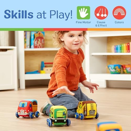 Product Description Product Description Pull these soft constructions vehicles back to get new skills rolling! The "rev up" mechanism inside each of these four construction vehicles (mixer, dump truck, loader, and crane) makes it easy for babies and toddlers to get big acceleration with just a little input: Pull back one of the soft vehicles, then release to see it zoom off across the floor! The action of rolling, grasping, and pulling back is great for developing motor skills and hand-eye coordination. Key Features: Soft pull-and-go vehicle set for babies and toddlers,Includes 4 soft vehicles: dump truck, mixer, loader, and crane,Soft, lightweight pieces are easy for young children to lift and roll,Part of Melissa & Doug K's Kids toys, created to develop cognitive, physical, and social skills,Ages 9 months+ This product is designed with premium quality, ensuring durability and superior performance.