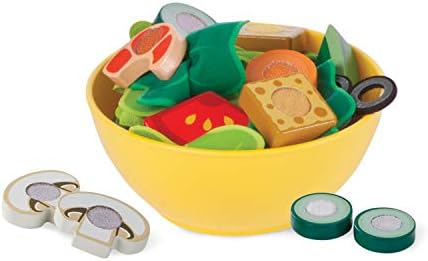 Product Description Make sensational pretend play salads fresh to order! The all-inclusive 52-piece set includes felt salad greens (kale, lettuce, and spinach) in hinged containers, slice-able wooden vegetables (carrots, tomatoes, cucumbers, mushrooms, and green peppers), proteins (shrimp and grilled chicken), and toppings (olives and croutons). For the finishing touch, two salad dressing bottles asquirta string! Place an order on the reusable menu card, slice the ingredients with a wooden knife on the cutting board, toss with wooden salad utensils in the bowl, and enjoy your fresh salad using the fork with self-stick tabs. Key Features: 50+-piece wooden and felt play food salad set with reusable double-sided menu,Includes greens, vegetables, proteins, and toppings,Slice on cutting board with wooden knife, toss in bowl and pretend to eat with wooden salad utensils,Self-stick tabs make acrunchinga sound when chopped and allow kids to pick up pieces with the fork; salad dressing bottles asquirta string when tipped,Makes a great gift for preschoolers, ages 3 to 6, for hands-on, screen-free play This product is designed with premium quality, ensuring durability and superior performance.