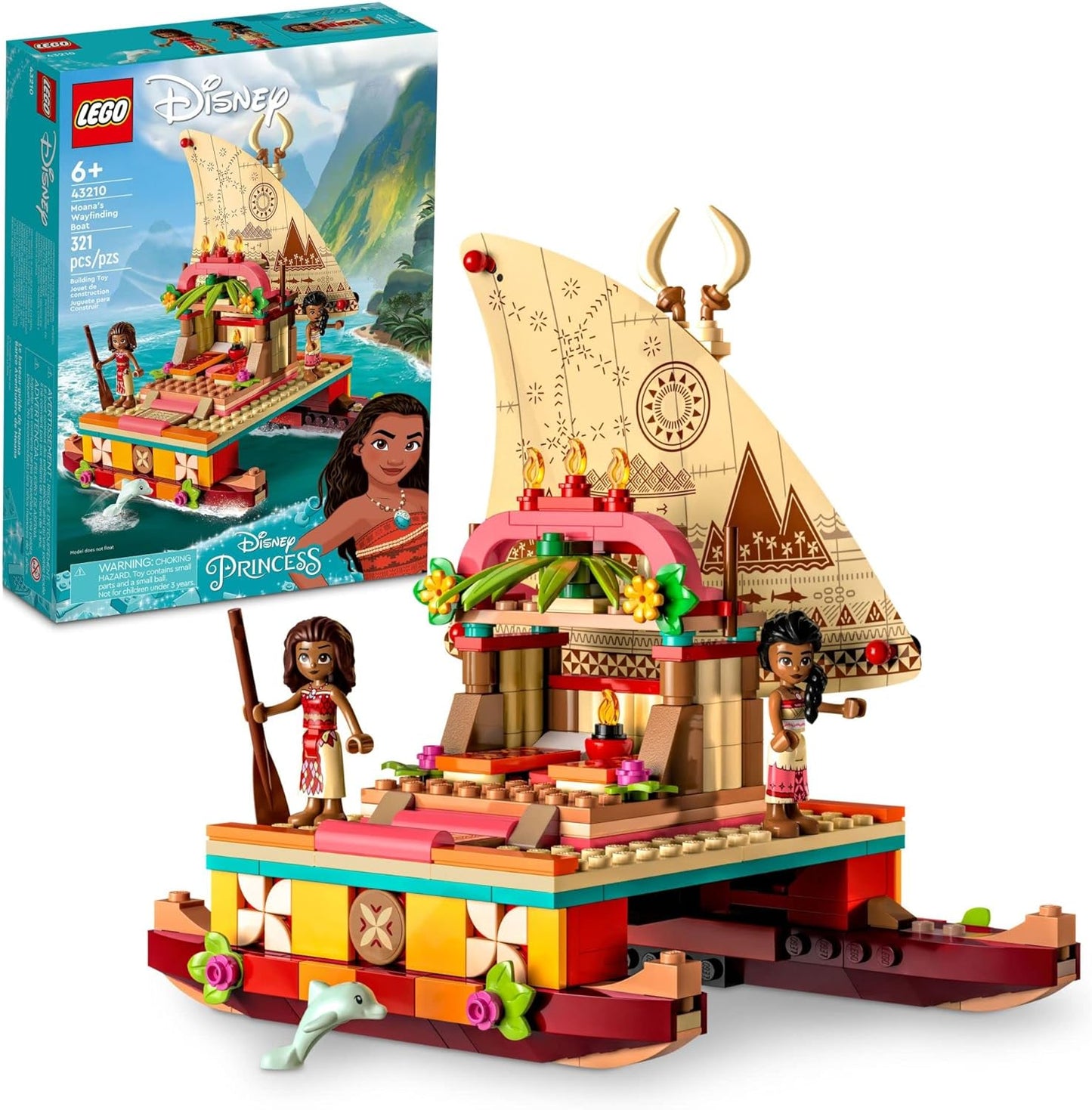 LEGO Disney Princess Moana's Wayfinding Boat " Moana & Sina Mini-Dolls with Dolphin Figure Set sail on a magical adventure with Moana and Sina in this enchanting LEGO set: Buildable Catamaran Boat: The double-hulled boat features a printed sail showcasing stories of the traditional Motunui people, perfect for Disney fans. Removable Shelter: Includes a cozy shelter with 2 beds and a small fire lamp element for realistic play. Moana & Sina Mini-Dolls: The set includes LEGO mini-doll figures of Moana and her mother Sina, along with a playful dolphin figure. Fun Play Accessories: Oar, drums, coconut food elements, and more to enhance imaginative play and storytelling. Perfect Gift for Disney Fans: Ideal for kids 6+, this set sparks creativity and makes a fantastic birthday or any-day gift for Disney Princess fans. Contains 321 pieces.