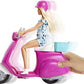 Product Description SummaryBarbieA doll inspires kids to take their imaginations on the road with a pink scooter thatA has gray and white details, rolls on working wheels and stands still with a kickstand. Clips on the handlebars hold Barbie doll's hands in place and a blue basket in back isA handy.A Barbie doll is travel chic wearing a printed romper andA shoes and has a helmetA for the ride.Subject to availability. Key Features: Cruise around in style with Barbie This product is designed with premium quality, ensuring durability and superior performance.
