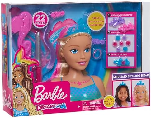 Product Description The Barbie Dreamtopia Styling Head is full of fantastical styling fun! Barbies thick flowing blonde and pink locks are perfect for curling and braiding into trendy designs! Use the hair ties and cute brush to give Barbie a whimsical up-do. Add some flair to her fabulous hair with customizable hair clips and barrettes. Key Features: Styling Head includes one Barbie Styling Head, one wear & share tiara, one hair curler, one brush, five customizable hair clips and barrettes, eight pop-in gems, and hair ties.,Inspired by Barbie Dreamtopia.,Brush Barbies blonde and pink hair with the cute matching pink brush!,Give Barbie up-dos with the hair ties and barrettes!,Customize the barrettes with fun, bright colored pop-in gems!,Ages 3+ This product is designed with premium quality, ensuring durability and superior performance.