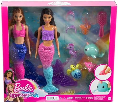 Product Description When girls play with Barbie, they imagine everything they can become! Play out the under-the-sea fun with this amazing set featuring two 12-in/30.40-cm Barbie mermaid dolls (both brunette) each with long, beautiful hair and dressed in colorful mermaid tops and fins. They also come with 4 ocean pets (some squirt water) plus 2 tiaras, a headband, necklace and brush for the ultimate splashy fun! Kids will love the endless possibilities for creative expression and storytelling play! Dolls cannot stand or swim alone. Colors and decorations may vary. Parental supervision required during water play. Key Features: Barbie Dreamtopia Ocean Adventure Dolls & Accessories,Brand: Barbie This product is designed with premium quality, ensuring durability and superior performance.