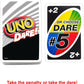 UNO Dare Card Game " Hilarious Challenges for Family Fun Take your classic UNO game to the next level with daring twists, silly challenges, and non-stop laughter. Daring Gameplay " Choose to draw 2 cards or complete a hilarious dare, like talking like a pirate or dancing like a robot. Three Dare Categories " Family, Show-Off, and Daredevil dares keep the fun exciting and unpredictable. Create Your Own Dares " Includes a blank card to add custom challenges. Colorblind-Friendly " Special symbols make it easy for everyone to play. Perfect for Any Occasion " Great for family game nights, parties, and gatherings. Ages 7+. Get ready for laughs, surprises, and unforgettable moments with UNO Dare.