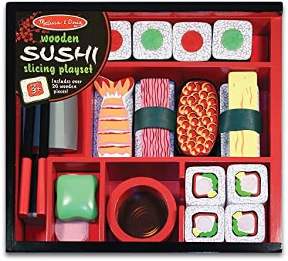 Product Description Product Description Who's ready for some sushi? This elegant 24-piece wooden sushi set is ready for playtime. The pretend sushi-making set is displayed beautifully in an organized, bright red storage box, and looks like the real thing! It includes sliceable wooden sushi rolls, shrimp, tuna, egg, roe toppings, and rice, and even little squares of pretend ginger and wasabi. Kids can imagine being a sushi chef as they slice the rolls using the pretend wooden cleaver. Key Features: Keep playtime rolling with this fun 24-piece wooden play food sushi-making set,Includes sliceable sushi rolls, shrimp, tuna, egg, and roe toppings, rice, dipping bowl, wooden knife, menu, and more,Frustration-free, self-stick chopsticks grip onto play food; self-stick tabs make realistic slicing sounds when "cut" with the wooden knife,Recognized as a top toy for children with special needs,Makes a great gift for preschoolers, ages 3 to 6, for hands-on, screen-free play This product is designed with premium quality, ensuring durability and superior performance.