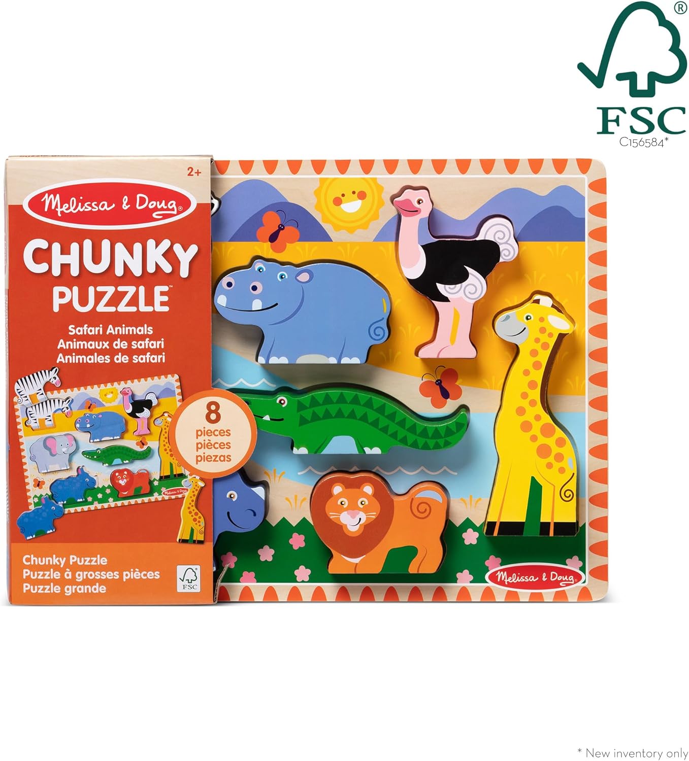Melissa & Doug Safari Wooden Chunky Puzzle (8 pcs) Embark on a wild adventure with the Safari Wooden Chunky Puzzle"a fun and engaging way for kids to explore the animal kingdom! Features: Safari-Themed Puzzle: Includes 8 extra-thick wooden pieces featuring adorable safari animals. Stand-Up Play Pieces: Puzzle pieces double as play figures for imaginative adventures. Durable Wooden Board: Sturdy construction ensures lasting fun and easy puzzle-solving. Skill Development: Encourages hand-eye coordination, fine motor skills, and creative expression. Perfect for Ages 2+: A wonderful gift that offers screen-free, hands-on play while fostering early learning. Let the safari-themed fun begin with this charming chunky puzzle!