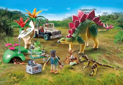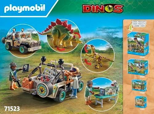 nan Key Features: Jungle exploration: Join the researchers on their exciting journey in the off-road vehicle and experience up close which dinosaurs they discover along the way Help uncover the secrets of the prehistoric era and advanced research!,Comprehensive research equipment for little explorers: Included are two brave researchers, a Stegosaurus, a Deinonychus, and everything you need for your expedition: microscope, laptop, walkie-talkies, camera, and much more!,The PLAYMOBIL Dinosaur World invites children aged four and up to dive into exciting role-playing adventures and experience the fascination of these giant reptiles at home Includes a knowledge card with fascinating dinosaur facts.,All PLAYMOBIL Dino World sets are made of over 80% recycled and bio-based materials.,Contents: 93 pieces with instructions: 2 figures, 4 animals, 87 additional accessories; materials made from plastic; LxWxH: Base plate with tree and tarp: approx 6.8 x 5.1 x 6.7 in; Terrain vehicle: approx 6.8 x 3.9 x 3.7 in, 71523 This product is designed with premium quality, ensuring durability and superior performance.