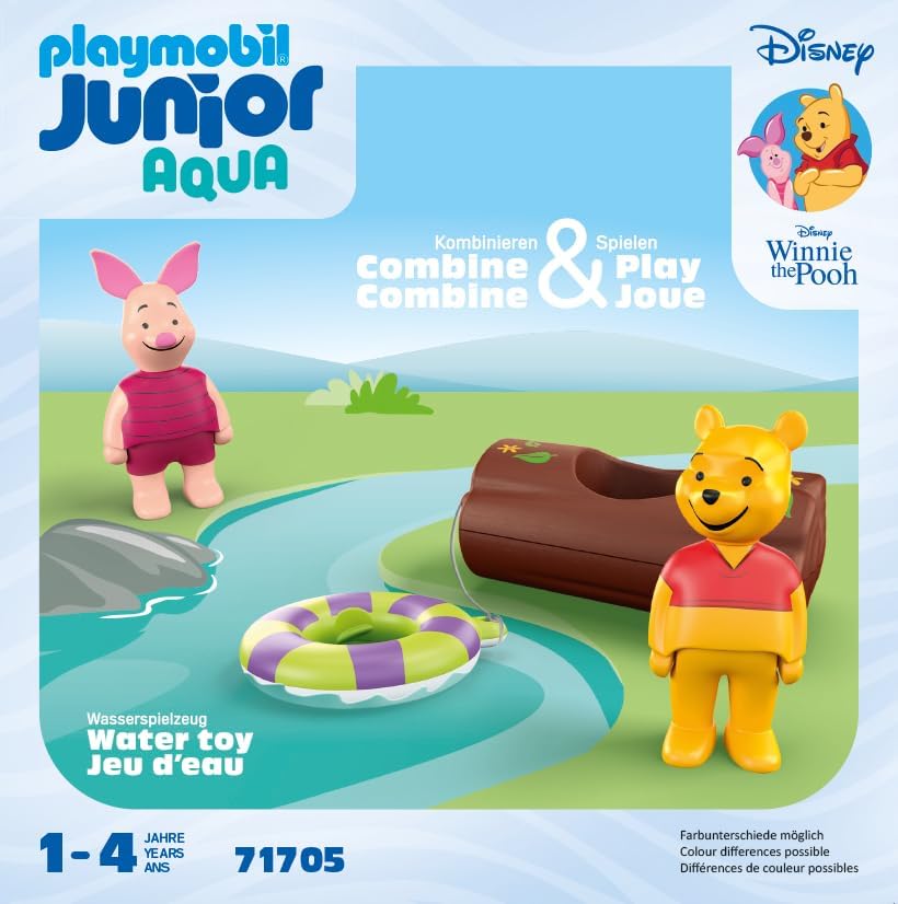Product Description Exciting water fun guaranteed! With the Water Adventure bath set inspired by Disney's Winnie the Pooh and Piglet, playful water exploration becomes a breeze. Your child develops their fine motor skills while having a blast in the tub, and they become more comfortable in the water. Let your child go on a wild ride through the bathtub with Winnie the Pooh and Piglet. The fun watercraft, consisting of a log boat and swim ring, makes for silly rides in the water. Key Features: Disney-inspired set: Let your child go on a wild ride through the bathtub with Winnie the Pooh and Piglet The fun watercraft, consisting of a log boat and swim ring, allows for amusing rides in the water Who is towing who here?,Safe play: PLAYMOBIL JUNIOR stands for maximum safety for your child The sets are manufactured in the EU, BP-free, and designed without small parts.,Sustainability: The PLAYMOBIL JUNIOR playsets are made from over 90% plant-based plastics For our packaging, we use at least 90% recycled cardboard as well as 100% recycled paper and avoid plastic wherever possible*,Toy for children ages 1+: The PLAYMOBIL JUNIOR sets are optimally designed for little hands with age-appropriate size, and featuring rounded edges This product is designed with premium quality, ensuring durability and superior performance.