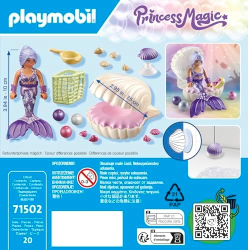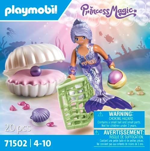 Product Description Collect magical shimmering pearls with the Mermaid with Pearl Seashell! Gather colorful and shiny pearls and seashells and place them in the basket for safe keeping. Once the fun task is completed, take a seat in the giant shell for a relaxing sit. Easily attach the purple shell to any smooth surface using the suction cup. For more magical mermaid fun, combine this playset with other PLAYMOBIL Mermaid sets (#71499- 71501, 71503-71504 a sold separately). Set includes one figure, pearl seashell, decorative shell with suction cup, and other accessories. Recommended for ages four to ten years. Warning. Key Features: Magical Pearls: Accompany the mermaid on her ocean adventure as she collects mysterious pearls Watch as the mermaid safely stores and hides the sparkling pearls in her pearl shell,Mysterious Accessories: Discover with the mermaid her clamshell treasure chest, pearl holder, and many other glittering extras as she roams through the enchanting underwater world and experiences exciting adventures,Toy for children ages 4+: Fits perfectly in children's hands due to age-appropriate size pieces, easy to hold thanks to its rounded edges,Everyday use: instructions for assembly (with parents), High quality and robust design, To clean the parts (not including stickers), place pieces under running water.,Contents: 20 pieces with instructions: 1 figure, 19 additional accessories; materials made from plastic; LxWxH: Giant clam: approx 5.59 x 5.59 x 1.61 in., 71502 This product is designed with premium quality, ensuring durability and superior performance.