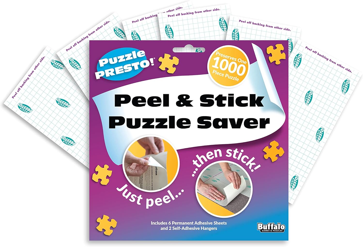 Puzzle Presto! Peel & Stick Puzzle Saver " Adhesive Sheets & Hangers Effortlessly preserve and display your completed puzzles with this original adhesive sheet solution by Buffalo Games. Permanent Protection " Keep your puzzles intact with an easy, mess-free application. Simple to Use " Just peel, stick to the back of your puzzle, and you're done"no glue or drying time needed. Ready to Display " Includes self-adhesive hangers, making it easy to showcase your masterpiece on the wall. Universal Fit " Comes with six large adhesive sheets, covering up to 29" x 21.5", ideal for puzzles of various sizes. Trusted by puzzle enthusiasts since 2007"proudly made in the USA.